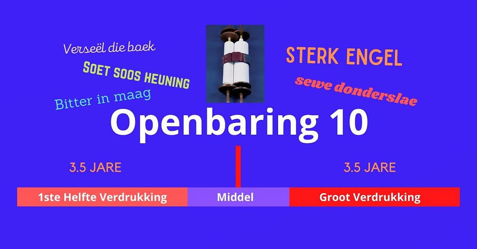 Johannes se engel sweer dat daar geen tyd meer sal wees nie. Ons het nou die halfpad merk bereik en daar is nou drie en ‘n half jare oor, die Groot Verdrukking. Daniel se visioen vertel ook van die laaste 3,5 jare of tyd, tye en ‘n halwe tyd wat oor is voor al hierdie dinge vervul is.