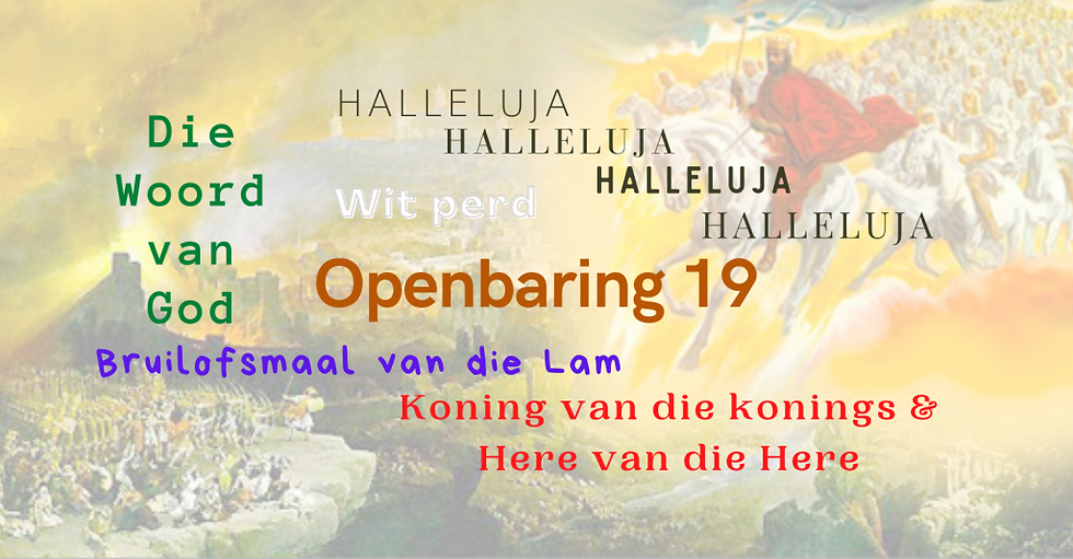 Halleluja! Hierdie hoofstuk open met vier halleluja’s in teenstelling met die trane van die vorige hoofstuk omdat die groot stad Babilon vernietig is. Die woord halleluja verskyn 24 keer in die Ou Testament boek Psalms, maar verskyn net 4 keer in die Nuwe Testament, en al vier die kere is in hierdie hoofstuk.